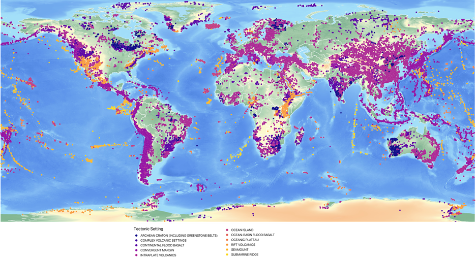 | Since 2021, the GEOROC database is hosted at the Georg-August-Universität Göttingen by the DIGIS-Project (Digital Geochemical Infrastructure). GEOROC provides access to geochemical analyses of igneous rocks and minerals. Thes database contains major and trace element values, isotope ratios, geochronological ages as well as metadata describing locations, samples, and analytical methods (see figure below). | | GEOROC data holdings of about 700.000 samples with rock and mineral analyses, 40.7 Million individual values from >23.000 publications