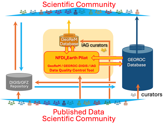 | For more than a quarter of a century, the GEOROC database (Geochemistry of Rocks of the Oceans and Continents) and GeoReM database (Geological and Environmental Reference Materials) have served the global geochemical and geoanalytical research communities. The GEOROC database is hosted at the Georg-August-Universität Göttingen by the DIGIS-Project (Digital Geochemical Infrastructure) and provides free access to published geochemical analyses of igneous rocks and minerals. GeoReM is internationally regarded as the leading resource for geological and environmental reference materials complete with metadata. | | Connecting GeoReM and GEOROC (figure above) forms the foundation for an NFDI4Earth-funded pilot project jointly led by DIGIS and the International Association of Geoanalysts (IAG). GeoReM was relocated from the Max-Planck-Society to the IAG, which ensures the data curation and long-term sustainability. DIGIS provides the technical development, bringing GEOROC and GeoReM together in a modern and interoperable IT infrastructure. Within this framework, our NFDI4Earth pilot currently aims to address a long-standing difficulty of evaluating the analytical quality of data compiled from different laboratories, methods and studies. The project is developing adaptable statistical and machine learning data-quality evaluation tools that uses the complementary strengths of GEOROC’s compositional data holdings and GeoReM’s extensive reference materials and metadata. One tool screens rare Earth element pattern to identify typographical errors, and other tools that assess outliers and inter-study bias based on metadata and reference materials.